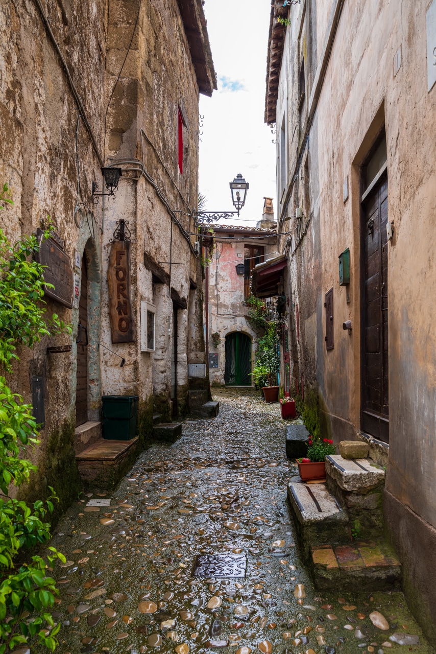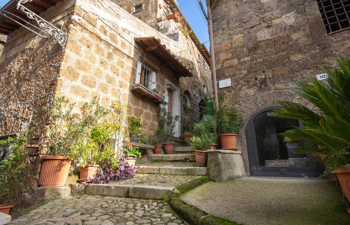 L’ingresso al borgo avviene attraverso un’unica porta ad arco che si apre su un dedalo di vie strette e tortuose, fiancheggiate da case medioevali costruite in pietra e tufo, inoltre vicino ad esso si trovano i resti del tempio falisco di Monte Li Santi. Case che, a tratti, lasciano spazio a cantine e piccoli negozi artigianali; e, lungo queste vie, improvvisi varchi offrono vedute spettacolari sulla verdissima valle del Treja.